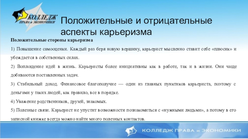 Слайд 7Положительные и отрицательные аспекты карьеризма