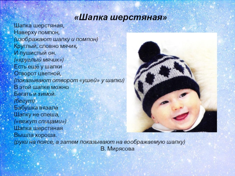 (руки на поясе, а затем показывают на воображаемую шапку)