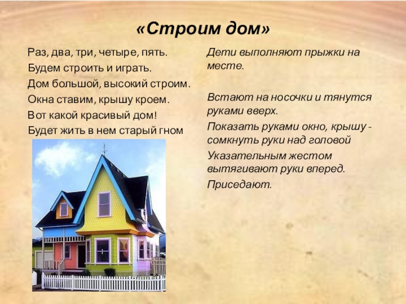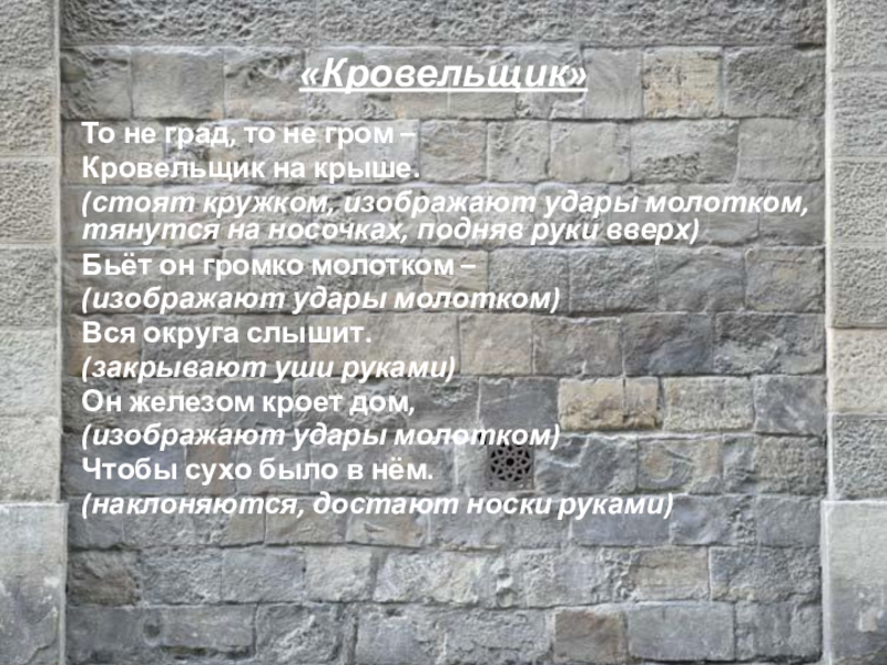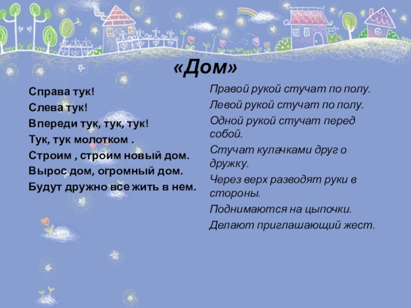 удары молотком, тянутся на носочках, подняв руки вверх)