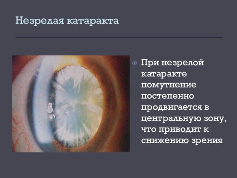 При незрелой катаракте помутнение постепенно продвигается в центральную зону, что
