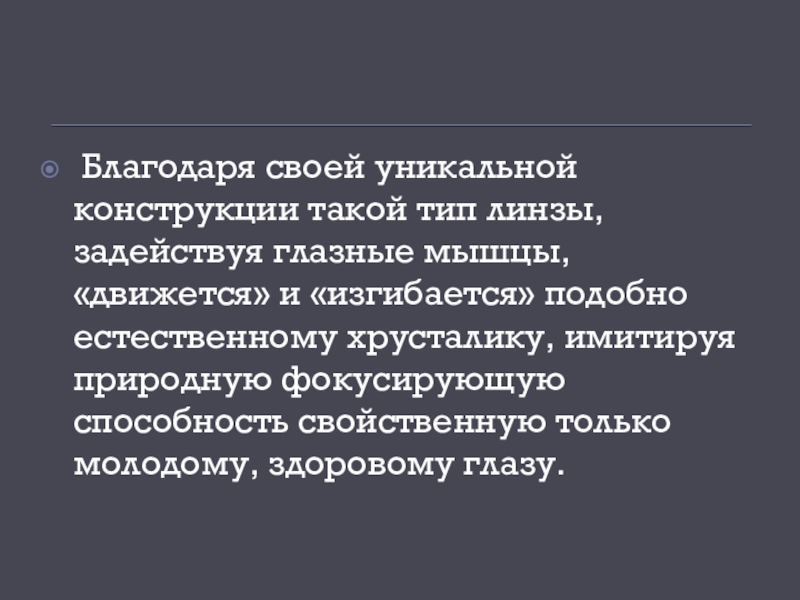Слайд 33 Благодаря своей уникальной конструкции такой тип линзы, задействуя глазные мышцы, «движется»