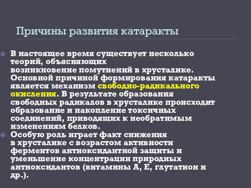 хрусталике. Основной причиной формирования катаракты является механизм свободно-радикального окисления. В результате образования свободных радикалов в хрусталике происходит образование и накопление токсичных соединений, приводящих к необратимым изменениям белков.