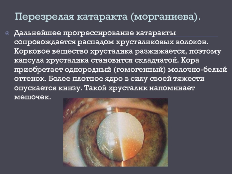 Слайд 19Перезрелая катаракта (морганиева).