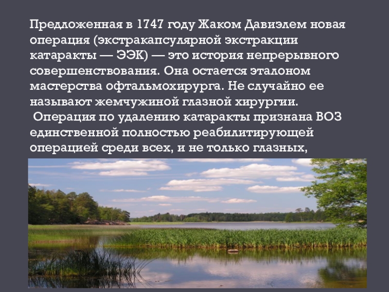 Слайд 26Предложенная в 1747 году Жаком Давиэлем новая операция (экстракапсулярной экстракции катаракты