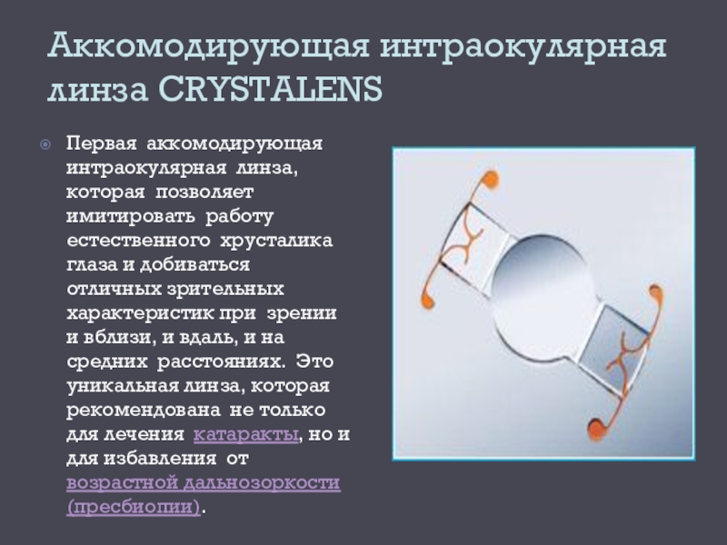 Слайд 31Аккомодирующая интраокулярная линза CRYSTALENS