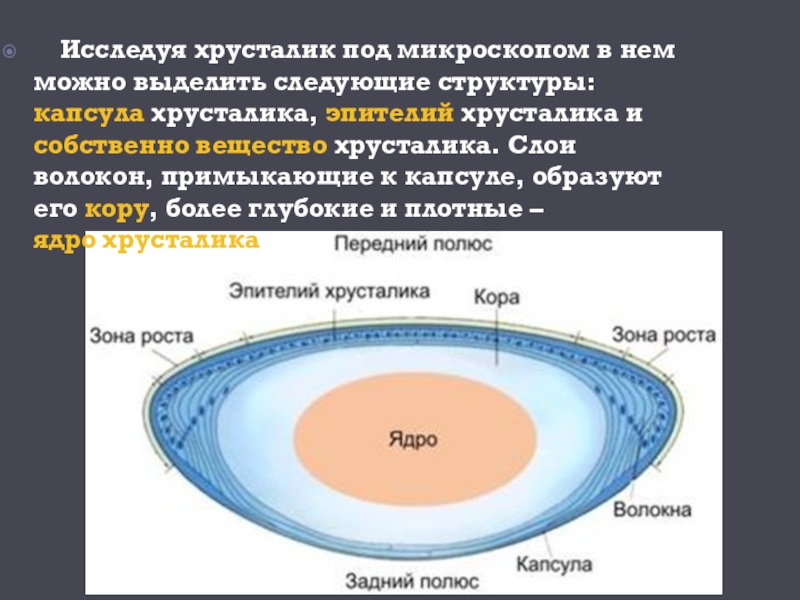 Слайд 7 Исследуя хрусталик под микроскопом в нем можно выделить следующие