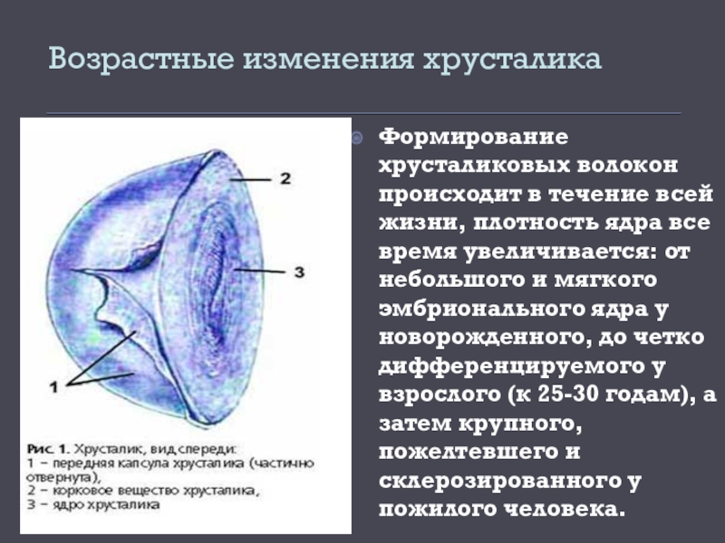 Формирование хрусталиковых волокон происходит в течение всей жизни, плотность ядра все