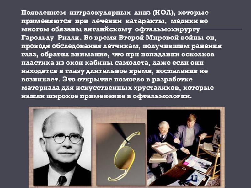 Слайд 28Появлением интраокулярных линз (ИОЛ), которые применяются при лечении катаракты, медики во