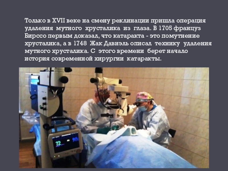 Слайд 25Только в XVII веке на смену реклинации пришла операция удаления мутного