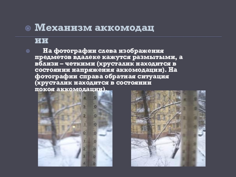 а вблизи – четкими (хрусталик находится в состоянии напряжения аккомодации). На фотографии справа обратная ситуация (хрусталик находится в состоянии покоя аккомодации).