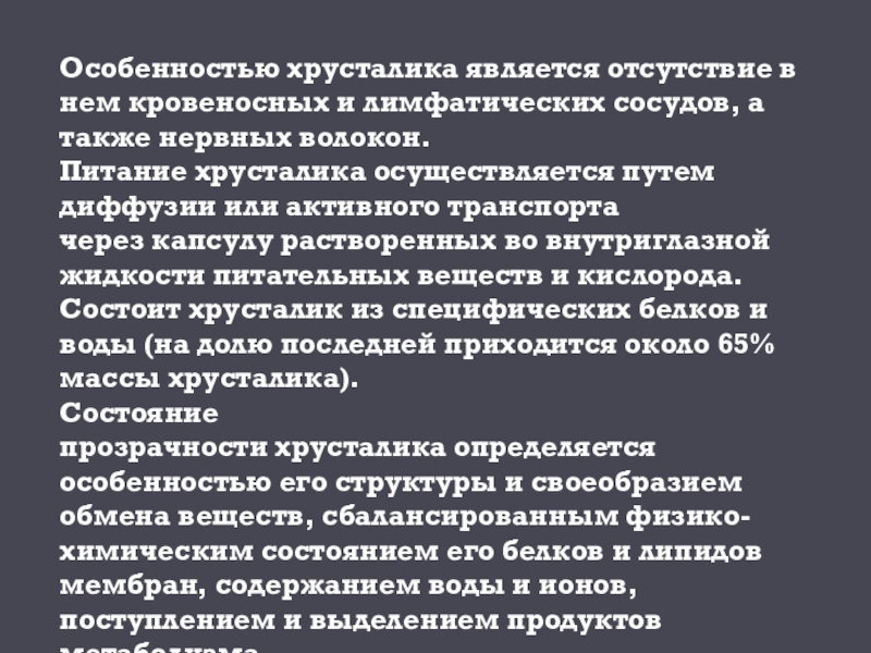 Состояние прозрачности хрусталика определяется особенностью его структуры и своеобразием обмена веществ, сбалансированным физико-химическим состоянием его белков и липидов мембран, содержанием воды и ионов, поступлением и выделением продуктов метаболизма.