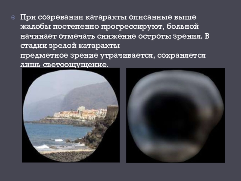 Слайд 21При созревании катаракты описанные выше жалобы постепенно прогрессируют, больной начинает отмечать снижение остроты зрения.