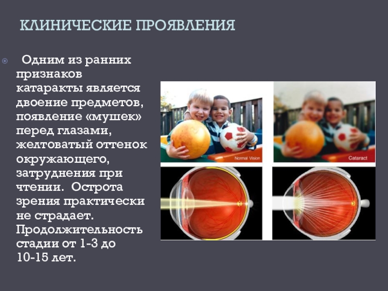 «мушек» перед глазами, желтоватый оттенок окружающего, затруднения при чтении. Острота зрения практически не страдает. Продолжительность стадии от 1-3 до 10-15 лет.