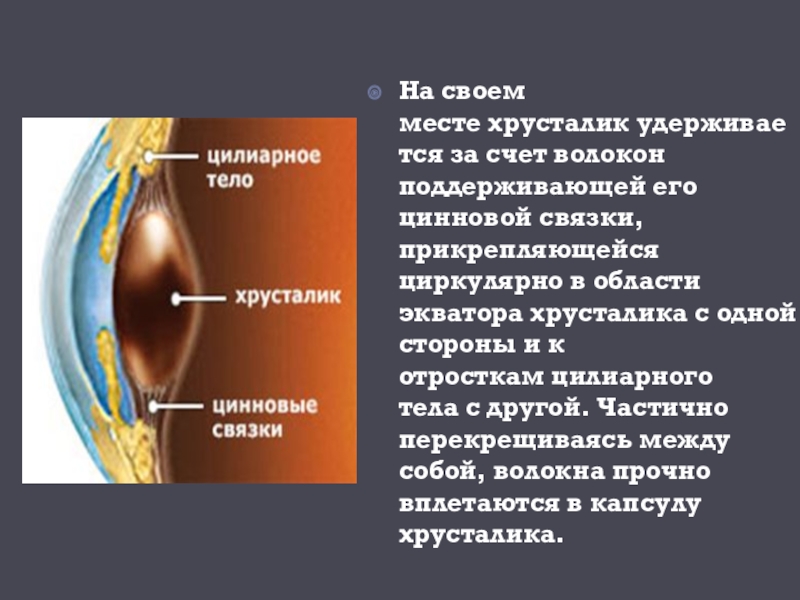 Слайд 6На своем месте хрусталик удерживается за счет волокон поддерживающей его цинновой связки, прикрепляющейся