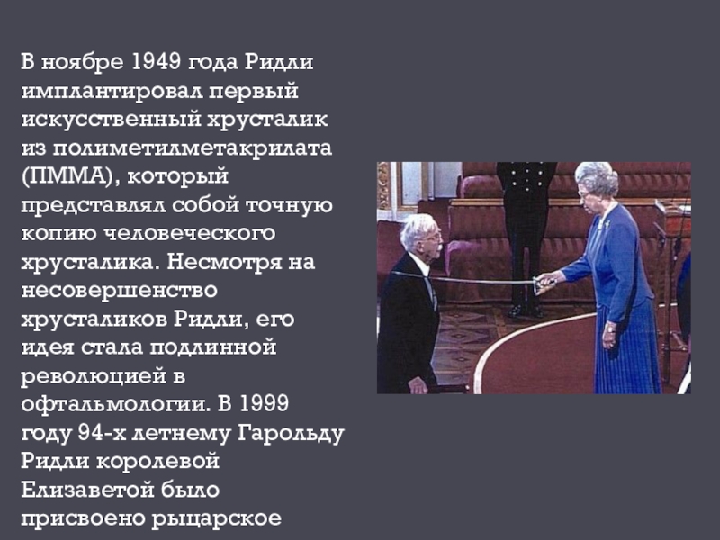 (ПММА), который представлял собой точную копию человеческого хрусталика. Несмотря на несовершенство хрусталиков Ридли, его идея стала подлинной революцией в офтальмологии. В 1999 году 94-х летнему Гарольду Ридли королевой Елизаветой было присвоено рыцарское звание.