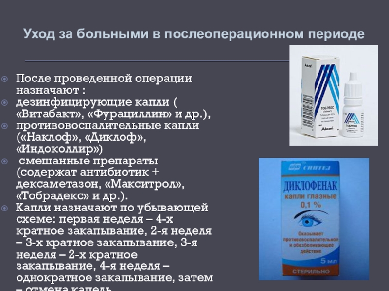 Капли назначают по убывающей схеме: первая неделя – 4-х кратное закапывание, 2-я неделя – 3-х кратное закапывание, 3-я неделя – 2-х кратное закапывание, 4-я неделя – однократное закапывание, затем – отмена капель.