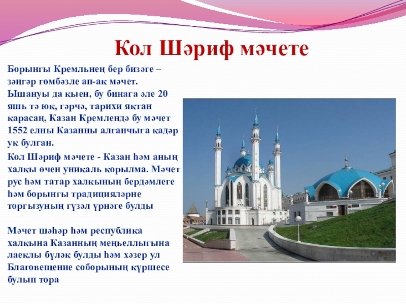 Кол Шәриф мәчете - Казан һәм аның халкы өчен уникаль корылма. Мәчет рус һәм татар халкының бердәмлеге һәм борынгы традицияләрне торгызуның гүзәл үрнәге булды Мәчет шәһәр һәм республика халкына Казанның меңьеллыгына лаеклы бүләк булды һәм хәзер ул Благовещение соборының күршесе булып тора