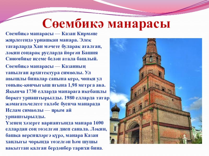 Сөембикә манарасы — Казанның танылган архитектура символы. Ул авышлы биналар санына керә, чөнки ул төньяк-көнчыгыш ягына 1,98 метрга ава. Якынча 1730 елларда манарага икебашлы бөркет урнаштырылды. 1980 елларда татар җәмагатьчелеге таләбе буенча манарада Ислам символы — ярым ай урнаштырылды. Үзенең хәзерге вариантында манара 1690 еллардан соң төзелгән диеп санала. Ләкин, башка версияләргә күрә, манара Казан ханлыгы чорында төзелгән һәм шушы вакыттан калган бердәнбер тарихи бина.