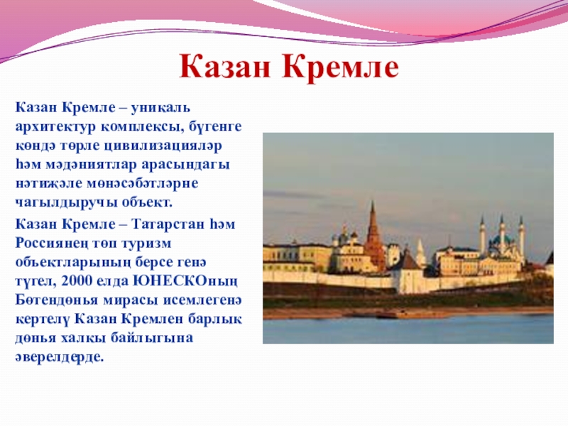 Казан КремлеКазан Кремле – уникаль архитектур комплексы, бүгенге көндә төрле цивилизацияләр һәм мәдәниятлар арасындагы нәтиҗәле мөнәсәбәтләрне чагылдыручы объект.Казан Кремле – Татарстан һәм Россиянең төп туризм объектларының берсе генә түгел, 2000 елда ЮНЕСКОның Бөтендөнья мирасы исемлегенә кертелү