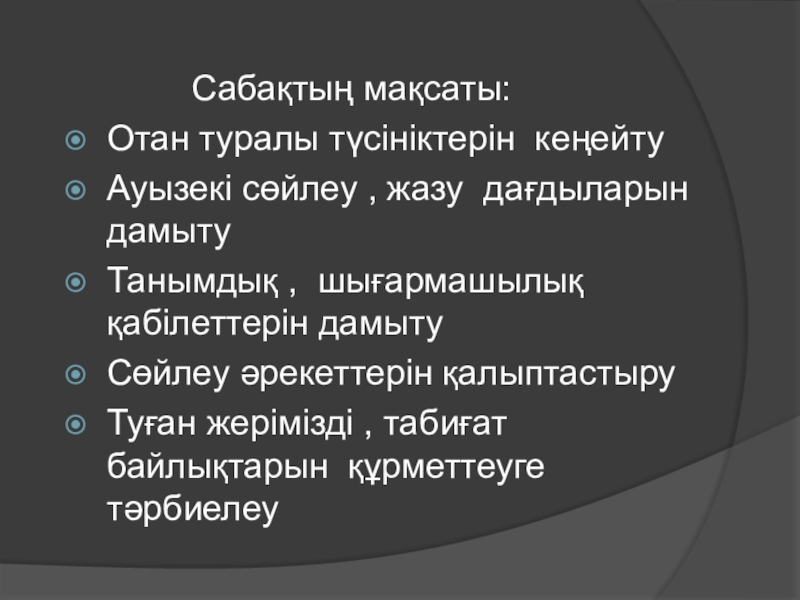 Сабақтың мақсаты:Отан туралы түсініктерін кеңейтуАуызекі сөйлеу , жазу дағдыларын дамытуТанымдық , шығармашылық қабілеттерін дамытуСөйлеу әрекеттерін қалыптастыруТуған жерімізді , табиғат байлықтарын құрметтеуге тәрбиелеу