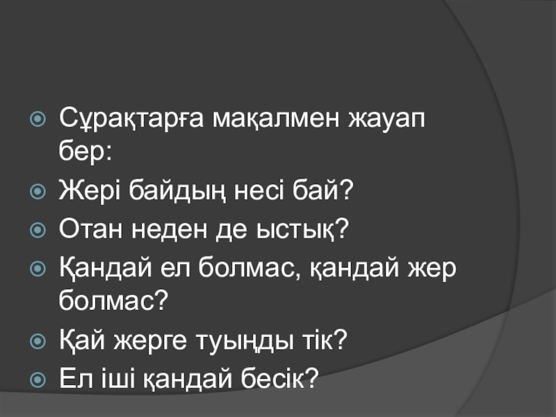 Сұрақтарға мақалмен жауап бер:Жері байдың несі бай?Отан неден де ыстық?Қандай ел болмас, қандай жер болмас?Қай жерге туыңды