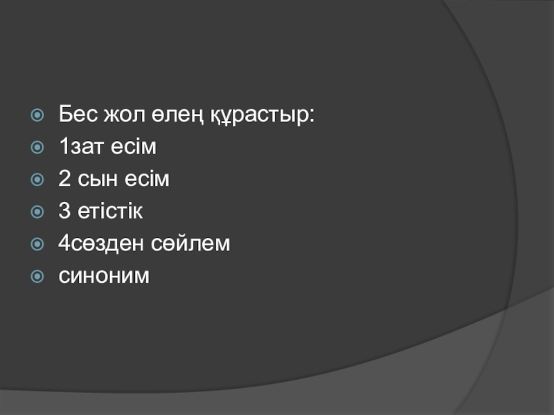 Бес жол өлең құрастыр:1зат есім2 сын есім3 етістік4сөзден сөйлемсиноним