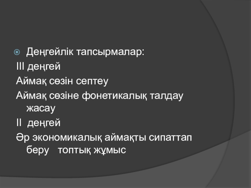 Деңгейлік тапсырмалар:ІІІ деңгейАймақ сөзін септеуАймақ сөзіне фонетикалық талдау жасауІІ деңгей Әр экономикалық аймақты сипаттап беру  топтық