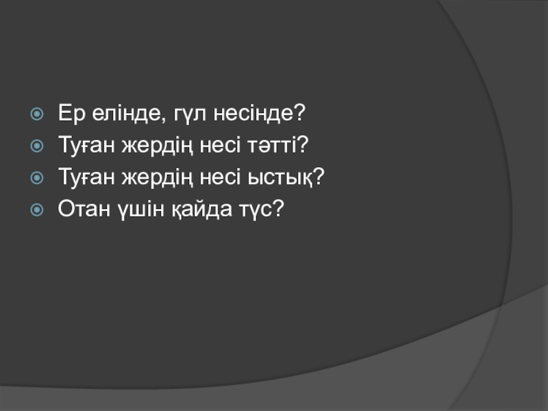 Ер елінде, гүл несінде?Туған жердің несі тәтті?Туған жердің несі ыстық?Отан үшін қайда түс?
