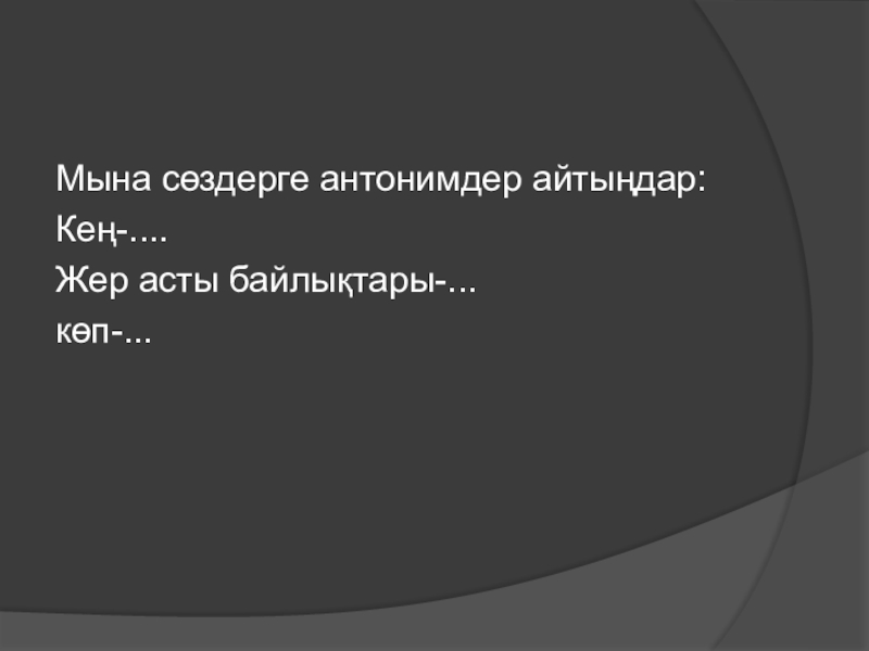 Мына сөздерге антонимдер айтыңдар:Кең-....Жер асты байлықтары-...көп-...