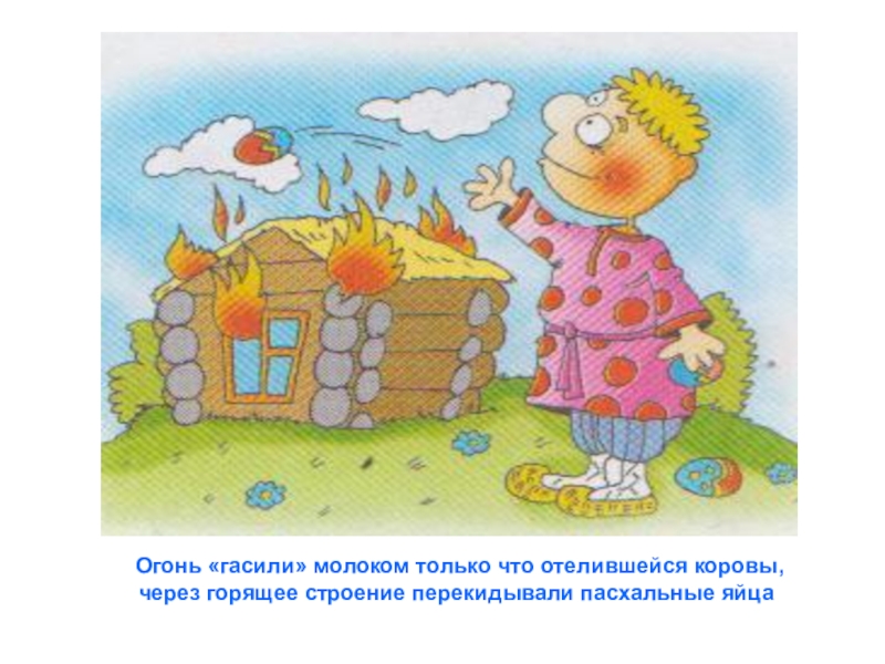 Слайд 10Огонь «гасили» молоком только что отелившейся коровы, через горящее строение перекидывали