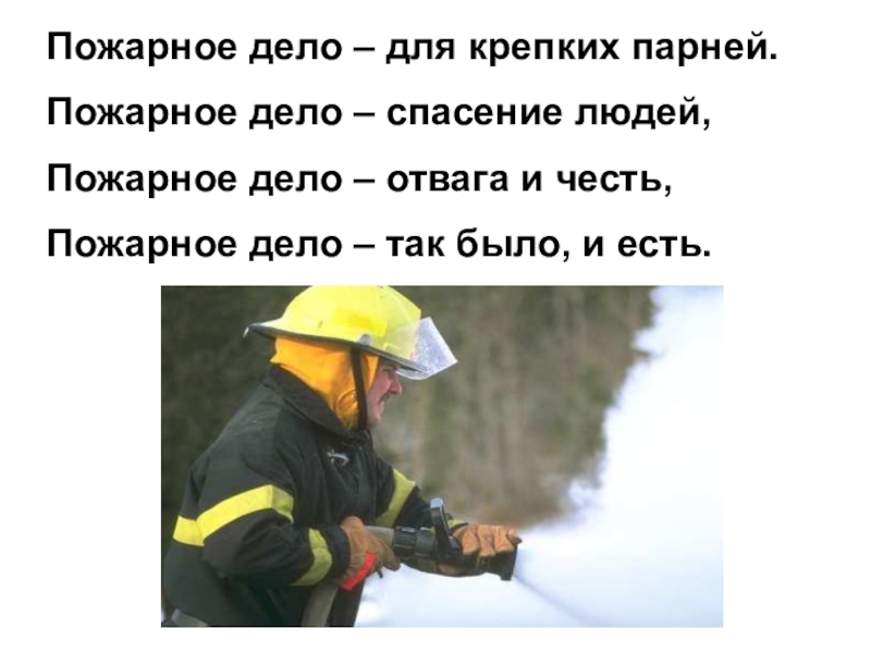Пожарное дело – для крепких парней.Пожарное дело – спасение людей,Пожарное дело – отвага и честь,Пожарное дело –