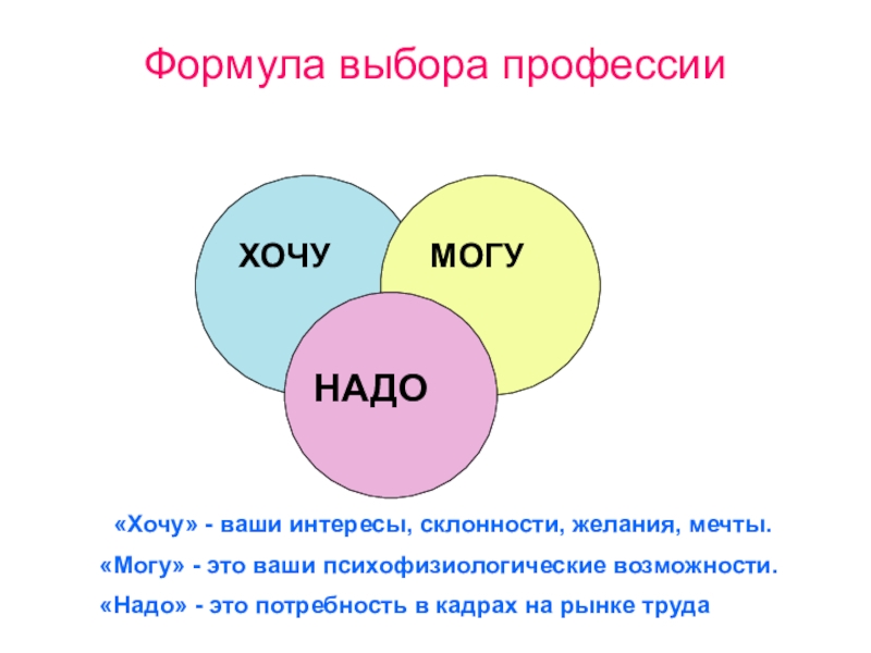 Формула выбора профессии     «Хочу» - ваши интересы, склонности, желания, мечты.