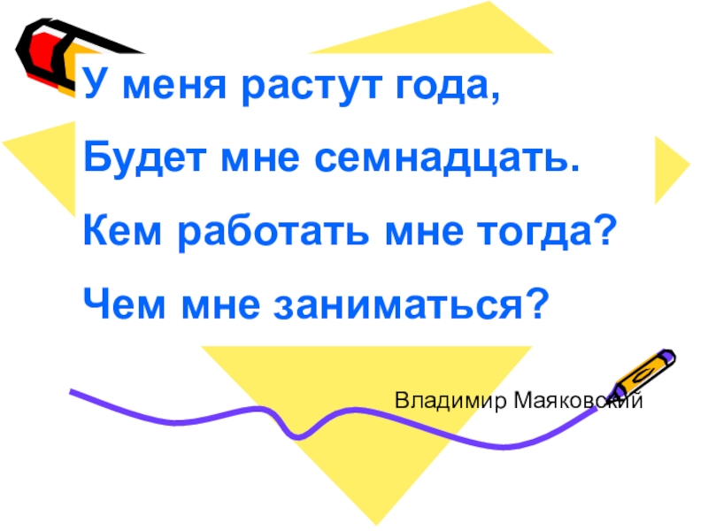 У меня растут года,Будет мне семнадцать.Кем работать мне тогда?Чем мне заниматься? Владимир Маяковский