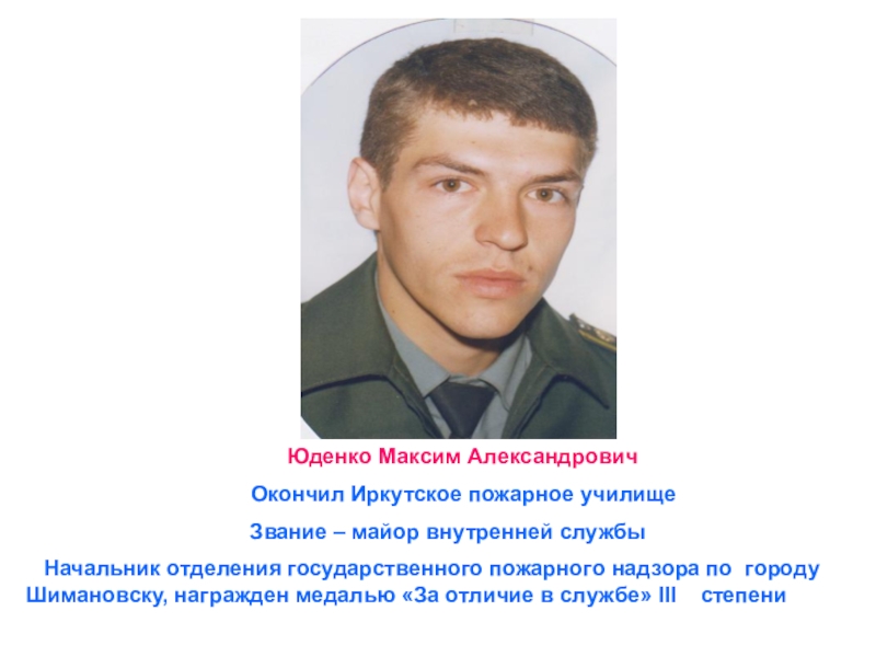 Начальник отделения государственного пожарного надзора по городу Шимановску, награжден медалью «За отличие в службе» III степени