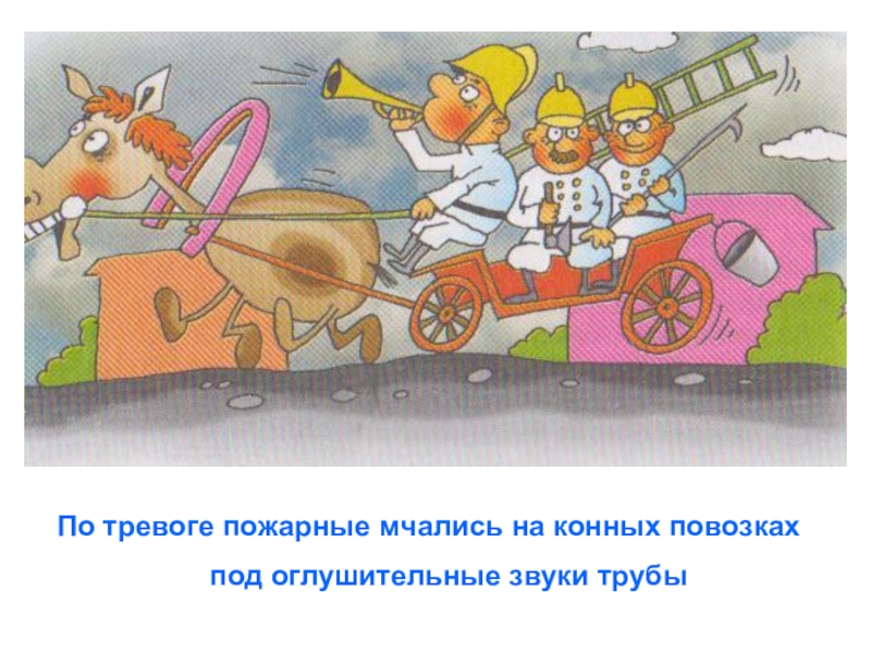 Слайд 12По тревоге пожарные мчались на конных повозках