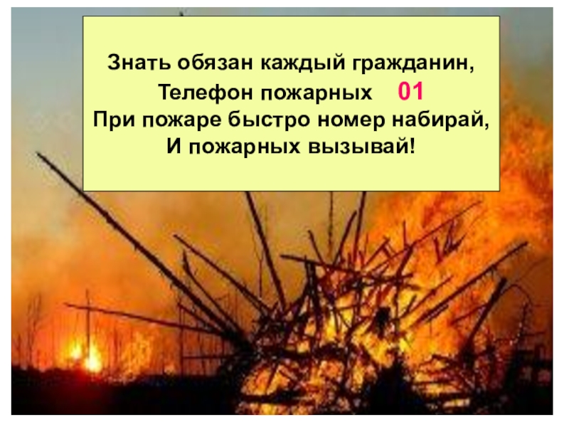 Знать обязан каждый гражданин,Телефон пожарных  01При пожаре быстро номер набирай,И пожарных вызывай!