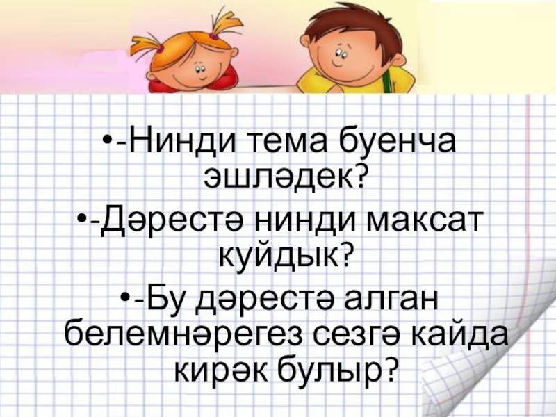 -Нинди тема буенча эшләдек?-Дәрестә нинди максат куйдык?-Бу дәрестә алган белемнәрегез сезгә кайда кирәк булыр?