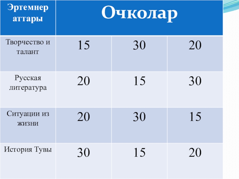 Дуруму:Бердинген одуругларнын кайы-бирээзин шилип алыр, улаштыр дужунда саннарны адаар. Саннар дээрге очколар болур. Шилип алган санда кандыг-бир