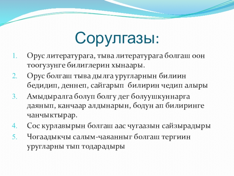 Сорулгазы:Орус литературага, тыва литературага болгаш оон тоогузунге билиглерин хынаары.Орус болгаш тыва дылга уругларнын билиин бедидип, деннеп, сайгарып билирин чедип алырыАмыдыралга болуп болгу дег болуушкуннарга даянып, канчаар алдынарын, бодун ап билиринге чанчыктырар.Сос курлавырын болгаш аас чугаазын сайзырадырыЧогаадыкчы