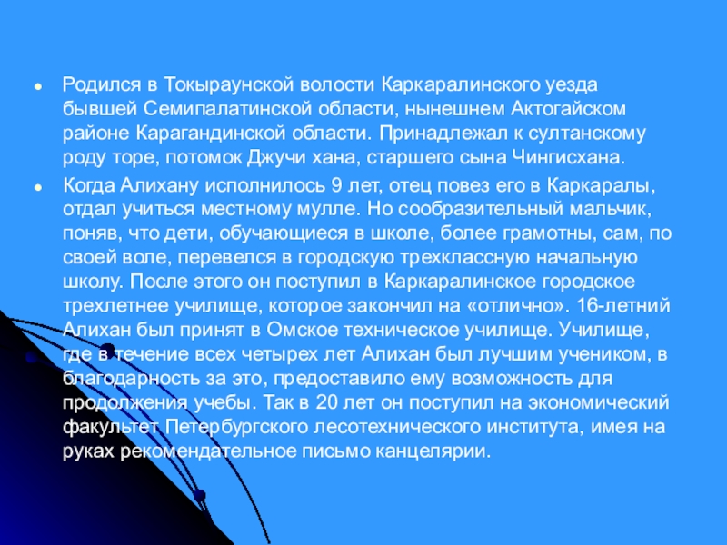 районе Карагандинской области. Принадлежал к султанскому роду торе, потомок Джучи хана, старшего сына Чингисхана.