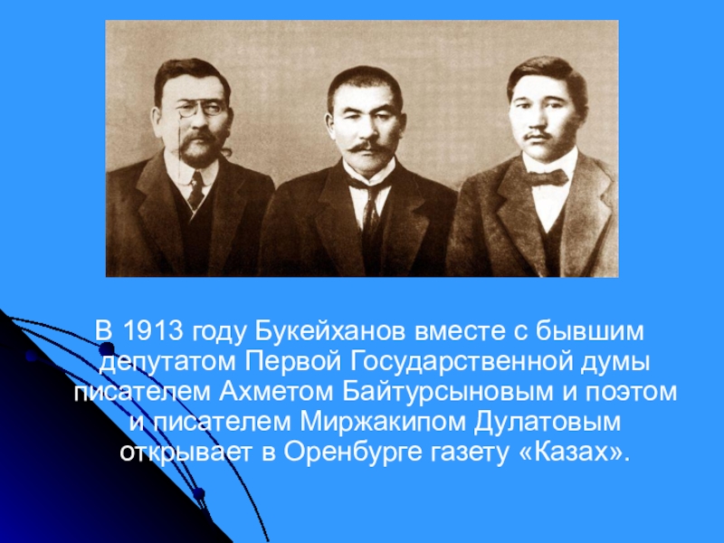 думы писателем Ахметом Байтурсыновым и поэтом и писателем Миржакипом Дулатовым открывает в Оренбурге газету «Казах».