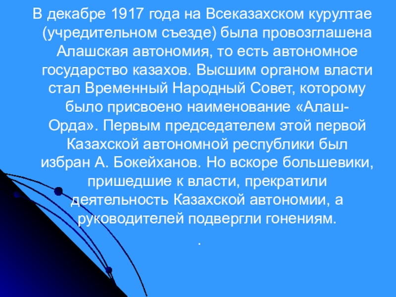 провозглашена Алашская автономия, то есть автономное государство казахов. Высшим органом власти стал Временный Народный Совет, которому было присвоено наименование «Алаш-Орда». Первым председателем этой первой Казахской автономной республики был избран А. Бокейханов. Но вскоре большевики, пришедшие к власти, прекратили деятельность Казахской автономии, а руководителей подвергли гонениям.