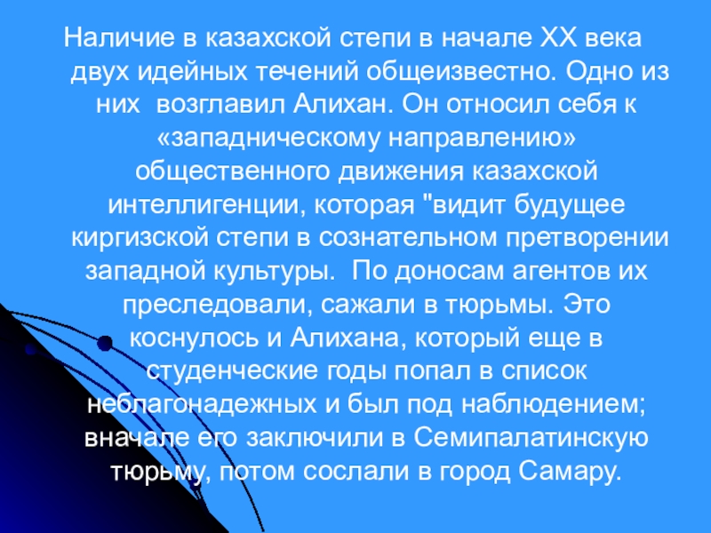 общеизвестно. Одно из них возглавил Алихан. Он относил себя к «западническому направлению» общественного движения казахской интеллигенции, которая "видит будущее киргизской степи в сознательном претворении западной культуры. По доносам агентов их преследовали, сажали в тюрьмы. Это коснулось и Алихана, который еще в студенческие годы попал в список неблагонадежных и был под наблюдением; вначале его заключили в Семипалатинскую тюрьму, потом сослали в город Самару.