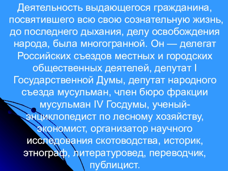 делу освобождения народа, была многогранной. Он — делегат Российских съездов местных и городских общественных деятелей, депутат I Государственной Думы, депутат народного съезда мусульман, член бюро фракции мусульман IV Госдумы, ученый-энциклопедист по лесному хозяйству, экономист, организатор научного исследования скотоводства, историк, этнограф, литературовед, переводчик, публицист.