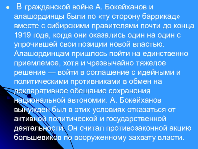 сторону баррикад» вместе с сибирскими правителями почти до конца 1919 года, когда они оказались один на один с упрочившей свои позиции новой властью. Алашординцам пришлось пойти на единственно приемлемое, хотя и чрезвычайно тяжелое решение — войти в соглашение с идейными и политическими противниками в обмен на декларативное обещание сохранения национальной автономии. А. Бокейханов вынужден был в этих условиях отказаться от активной политической и государственной деятельности. Он считал противозаконной акцию большевиков по вооруженному захвату власти.