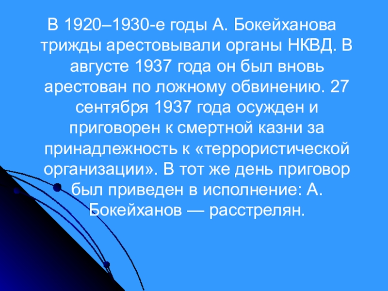 В 1920–1930-е годы А. Бокейханова трижды арестовывали органы НКВД. В
