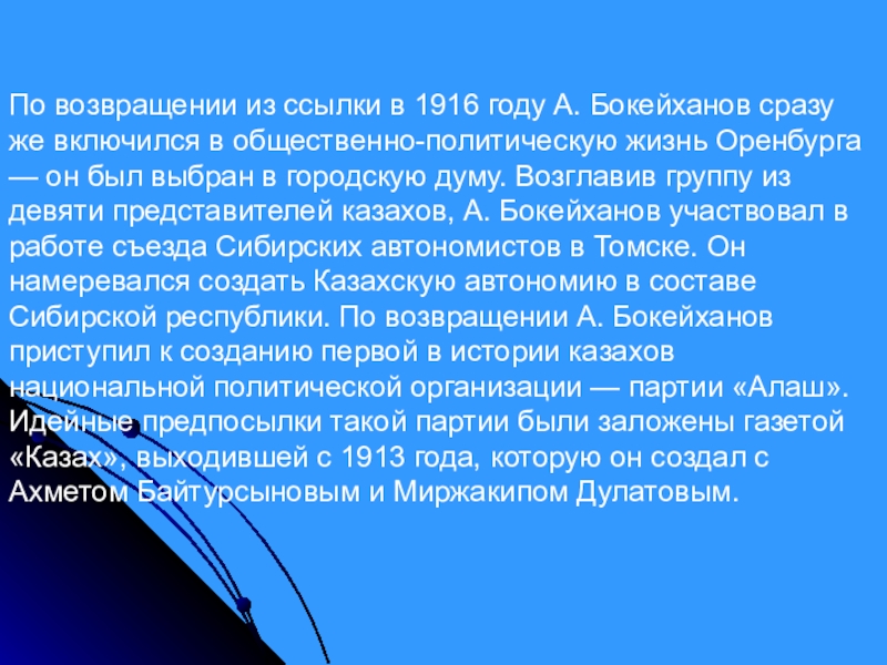 По возвращении из ссылки в 1916 году А. Бокейханов сразу же