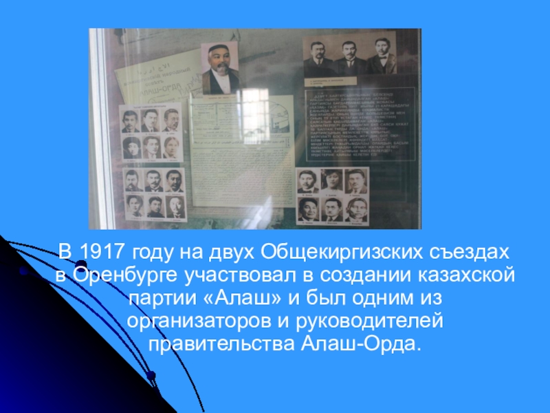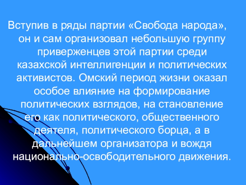 группу приверженцев этой партии среди казахской интеллигенции и политических активистов. Омский период жизни оказал особое влияние на формирование политических взглядов, на становление его как политического, общественного деятеля, политического борца, а в дальнейшем организатора и вождя национально-освободительного движения.