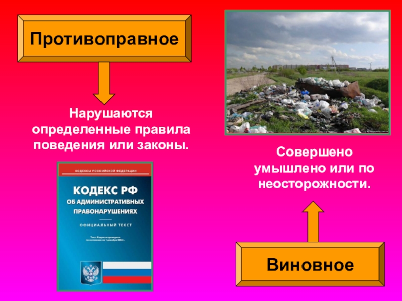 ПротивоправноеНарушаются определенные правила поведения или законы.ВиновноеСовершено умышлено или по неосторожности.