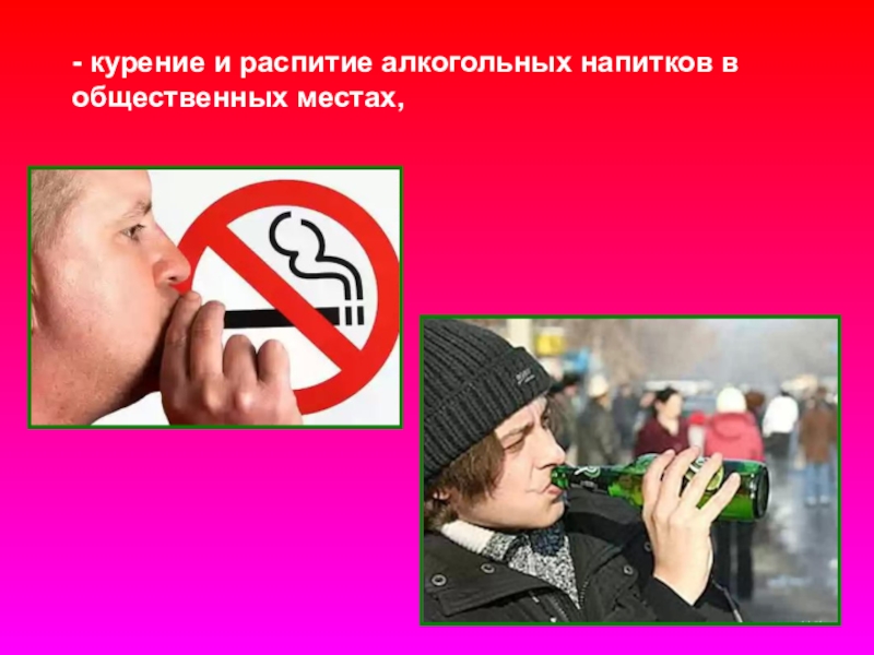Слайд 18- курение и распитие алкогольных напитков в общественных местах,